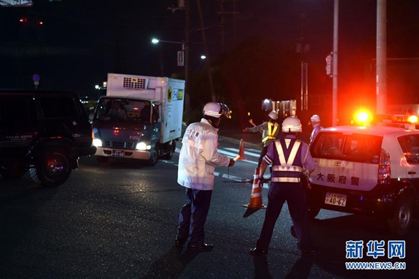 6月18日,在日本大阪,警察疏導(dǎo)過往車輛。據(jù)日本氣象廳消息,當(dāng)?shù)貢r(shí)間18日上午7時(shí)58分,日本大阪府發(fā)生6.1級(jí)地震。新華社記者馬平 攝