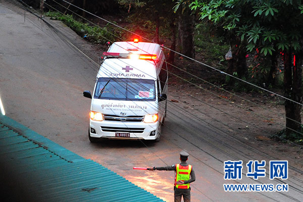 這是7月8日在泰國清萊拍攝的運送被解救出的少年足球隊員的救護車。新華社發(拉亨 攝)