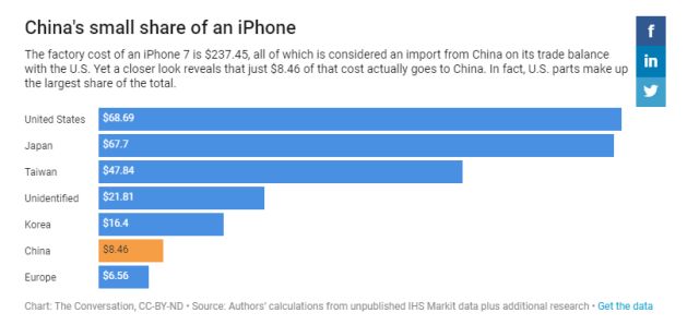 而這,便會(huì)令人以為美國在這個(gè)蘋果手機(jī)的貿(mào)易上對中國損失了240美元。那么如此計(jì)算的話,去年一年美國僅在iPhone7和iPhone7 Plus這兩款蘋果手機(jī)上就與中國有了157億美元的“貿(mào)易逆差”。
