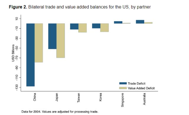 更引人注目的是,如此計(jì)算的話,那么比如2004年時(shí)日本和美國的貿(mào)易逆差就會(huì)暴增33%,直接逼近當(dāng)時(shí)中美按這種算法得出的貿(mào)易逆差了——畢竟,在不少中國出口給美國的產(chǎn)品中,擁有專利技術(shù)的日本的“附加價(jià)值”是很高的。