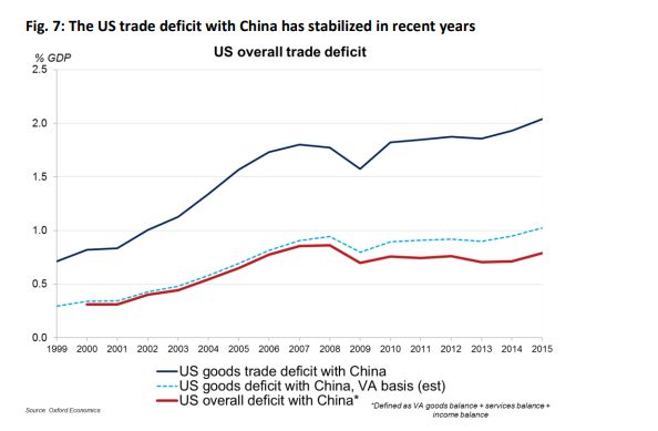 而如果再算上美國在服務(wù)領(lǐng)域?qū)χ袊捻槻睿约懊绹鴮θA投資的各項(xiàng)收益,那么中美之間實(shí)際的逆差更會(huì)進(jìn)一步縮小到美國GDP的0.8%。