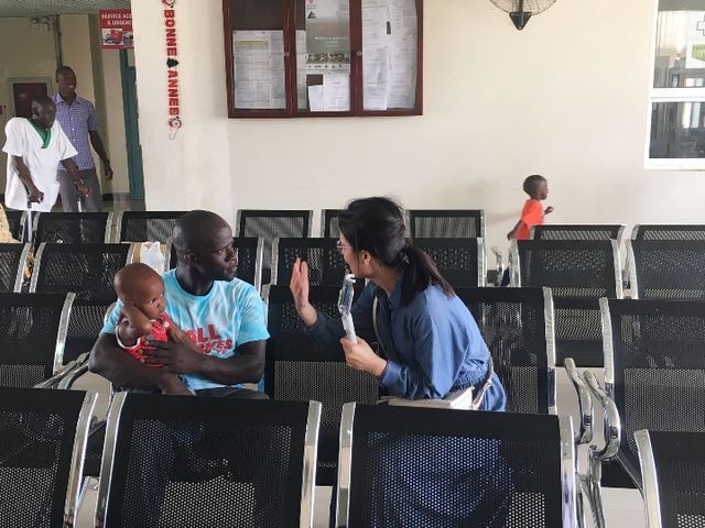 2018年7月18日,中國援建塞內加爾兒童醫院候診室,蘇利曼·費迪奧爾抱著孩子接受記者采訪。(新華社記者蔣國鵬攝)
