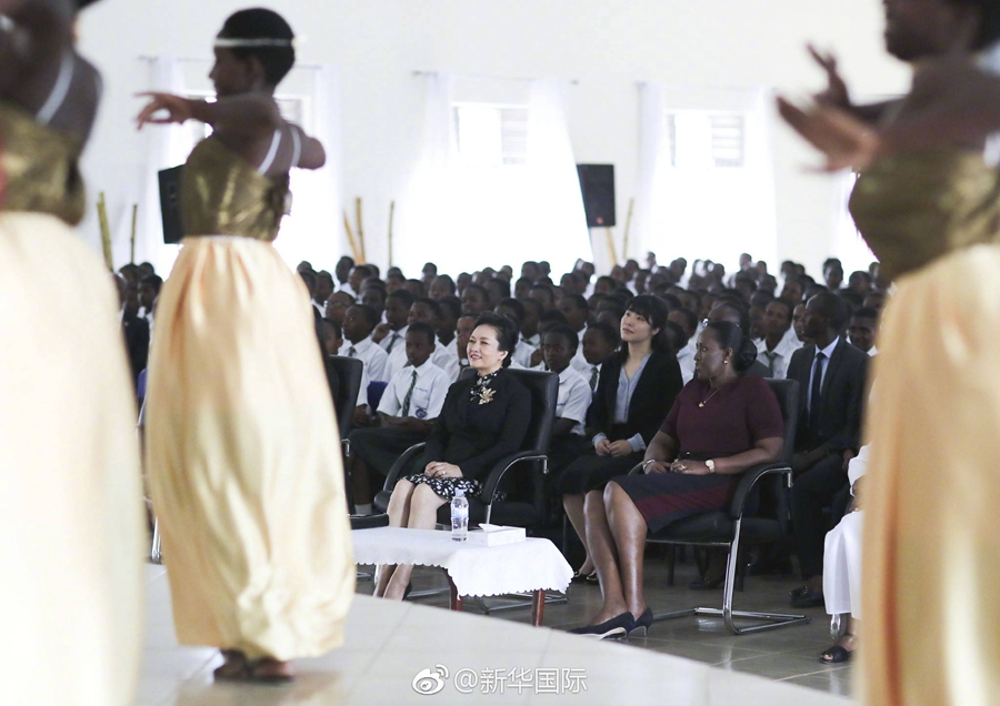 23日上午,國家主席習(xí)近平夫人彭麗媛參觀了盧旺達(dá)法維女子中學(xué)。全校師生聚集在學(xué)校大禮堂,歡迎中國貴賓到來。當(dāng)彭麗媛走進(jìn)會(huì)場時(shí),掌聲雷動(dòng)。同學(xué)們?yōu)榕睇愭鲁噬狭艘粓鼍恃莩觯簩W(xué)校校歌合唱高亢激昂、中國經(jīng)典名曲《茉莉花》悠揚(yáng)嘹亮、盧旺達(dá)民族舞蹈熱情奔放。彭麗媛不斷為學(xué)生的出色表演鼓掌。演出結(jié)束后,彭麗媛向?qū)W校贈(zèng)送了一批教學(xué)用品,祝愿學(xué)校越來越好。一位同學(xué)向彭麗媛贈(zèng)送了一幅自己專門創(chuàng)作的畫像。彭麗媛高興地接過畫像大加稱贊,親吻這位同學(xué)的臉頰,并同她親切擁抱。彭麗媛對(duì)全校師生的熱情接待表示感謝。