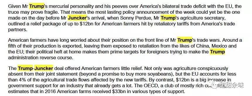 2.從英國媒體的報道切入點來看,英國作為歐洲國家的重要代表(雖然英國已經(jīng)發(fā)布了脫歐白皮書,但是在歐盟的官網(wǎng)上,歐盟的28個國家里,目前仍然是包括了United Kingdom的),對美國對外咋咋呼呼給各國添亂、實際上不動聲色自有打算的做法并不感冒。管中窺豹,或可判斷容克代表歐盟剛剛表過的態(tài)的不確定性將進一步上升,除了德國、法國之外,英國也不可能真的跟美國好到一個鼻孔出氣。更不要說在歐盟內部農(nóng)業(yè)出口占大頭的其他國家。