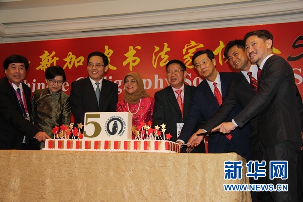 中國駐新加坡大使洪小勇(左三)、新加坡總統哈莉瑪·雅各布(左四)和新加坡書法家協會會長陳聲桂,在新加坡書法家協會成立50周年慶午宴上切蛋糕。記者王麗麗