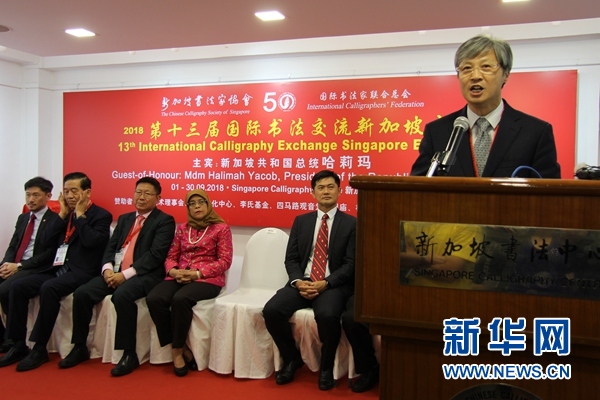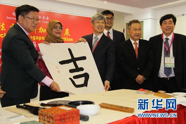 新華社新加坡9月1日電(記者王麗麗 夏立新)第13屆國際書法交流大展9月1日在新加坡書法中心開幕,新加坡總統哈莉瑪·雅各布出席了開幕式并當眾揮毫。