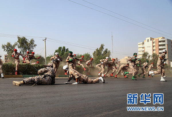 9月22日,在伊朗胡齊斯坦省首府阿瓦士,士兵們躲避襲擊。新華社發