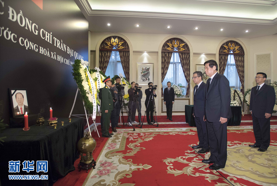 栗戰(zhàn)書敬獻(xiàn)花圈并在吊唁簿上題詞,對陳大光主席逝世表示深切哀悼。栗戰(zhàn)書表示,中方高度評價陳大光主席為發(fā)展中越兩黨兩國關(guān)系所作重要貢獻(xiàn),習(xí)近平總書記、國家主席專門向阮富仲總書記發(fā)去唁電,正在訪越的中共中央政治局常委、中央紀(jì)委書記趙樂際出席了在河內(nèi)的悼念活動。中越互為友好鄰邦和戰(zhàn)略伙伴,中方愿同越方一道,弘揚(yáng)傳統(tǒng)友誼、增進(jìn)政治互信、深化互利合作,推動中越兩黨兩國關(guān)系不斷發(fā)展。