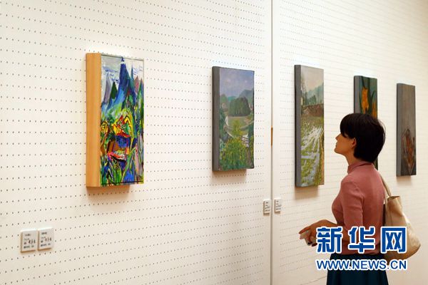 10月8日,在日本東京世田谷美術館,一位觀眾欣賞展出的中國藝術家畫作。 新華社記者王可佳攝