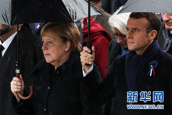 11月11日,法國總統(tǒng)馬克龍(右)與德國總理默克爾從法國巴黎的香榭麗舍大街走向凱旋門,參加一戰(zhàn)結(jié)束百年紀(jì)念儀式。新華社記者 鄭煥松 攝
