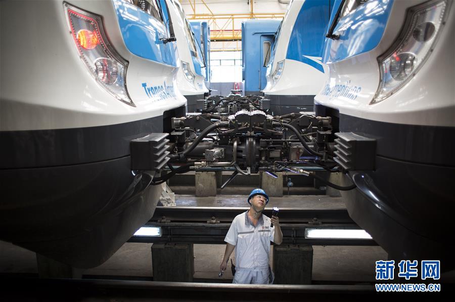 2017年4月11日,在位于阿根廷首都布宜諾斯艾利斯以南的利亞瓦略爾,中方技術人員檢查為羅卡線城際鐵路提供的列車。近年來,在阿根廷,中車制造的各種軌距、各種制式、各種型號的鐵路機車、動車組、客車、貨車和地鐵列車密集交付。新華社發(馬丁·薩巴拉 攝)