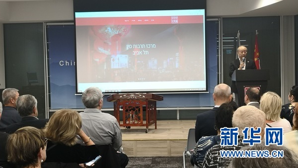 中國駐以色列大使詹永新在特拉維夫中國文化中心慶祝成立一周年活動上致辭。新華社記者陳文仙攝