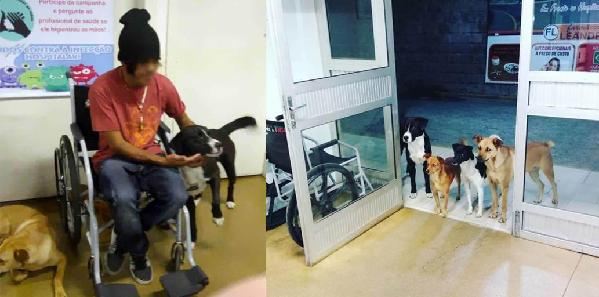 他的“家屬”——四只流浪狗趕來“陪護”