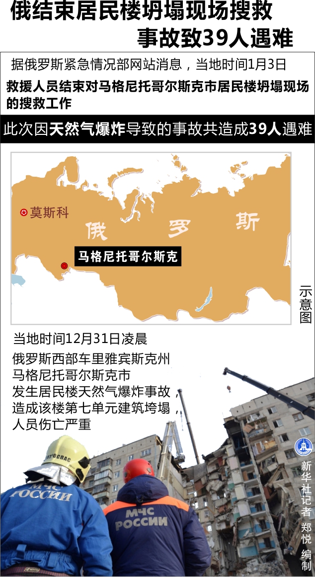 新華社莫斯科1月3日電(記者欒海)據(jù)俄羅斯緊急情況部網(wǎng)站消息,救援人員3日結(jié)束對馬格尼托哥爾斯克市居民樓坍塌現(xiàn)場的搜救工作,此次因天然氣爆炸導致的事故共造成39人遇難。