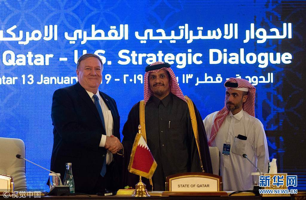 2019年1月13日,卡塔爾多哈,美國國務(wù)卿邁克·蓬佩奧訪問卡塔爾。蓬佩奧與卡塔爾副首相兼外交大臣穆罕默德在多哈的喜來登大酒店簽署了諒解備忘錄和意向聲明并舉行聯(lián)合記者會。蓬佩奧表示,兩國外交部門領(lǐng)導(dǎo)人當(dāng)天簽署了一份諒解備忘錄,將擴建和改造烏代德美國空軍基地。(圖片來源:視覺中國)