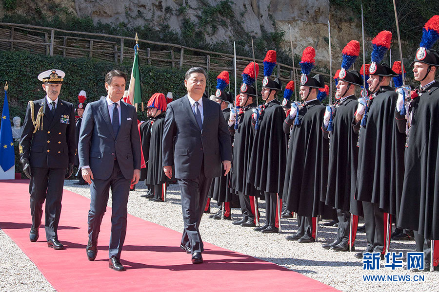 3月23日,國家主席習(xí)近平在羅馬同意大利總理孔特會談。這是習(xí)近平抵達時,孔特總理在停車處迎接。兩國領(lǐng)導(dǎo)人一同檢閱儀仗隊。(新華社記者李學(xué)仁攝)