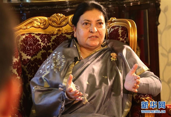 4月18日,在尼泊爾首都加德滿都總統府,尼泊爾總統比迪亞·德維·班達里接受中國媒體記者聯合采訪。新華社發(蘇尼爾·夏爾馬 攝)