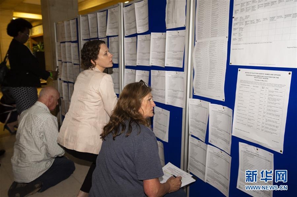 5月26日,在英國南安普敦的一個計票站,媒體和黨派成員查看投票結果。新華社發(fā)(雷伊·唐 攝)