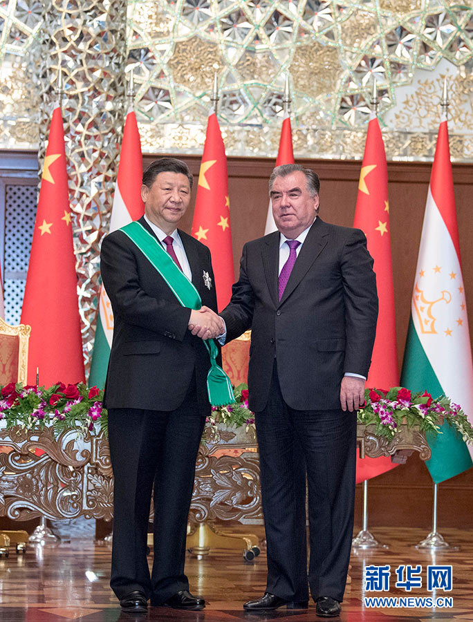 6月15日,國家主席習(xí)近平在杜尚別出席儀式,接受塔吉克斯坦總統(tǒng)拉赫蒙授予“王冠勛章”。 新華社記者 沙達提 攝