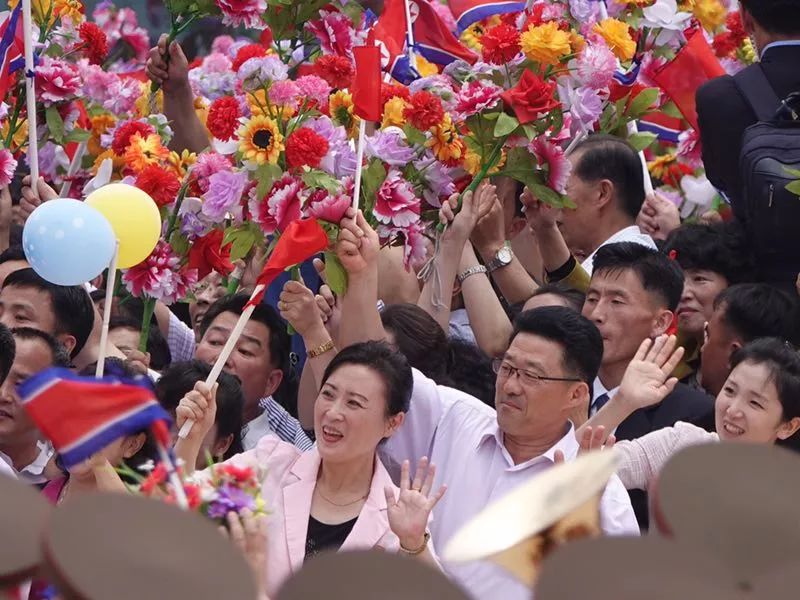 到處都是熱情的笑臉,友好的歡呼聲不絕于耳。習近平和金正恩向歡迎的人群頻頻揮手致意。