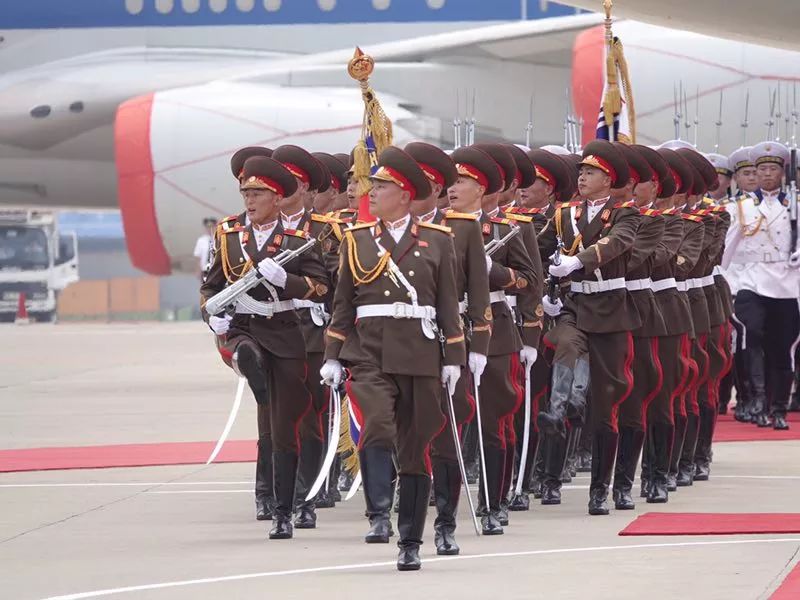 朝方在機場舉行隆重歡迎儀式。在21響禮炮聲中,軍樂隊奏中朝兩國國歌,習近平在金正恩陪同下檢閱了朝鮮人民軍三軍儀仗隊,并觀看了分列式表演。