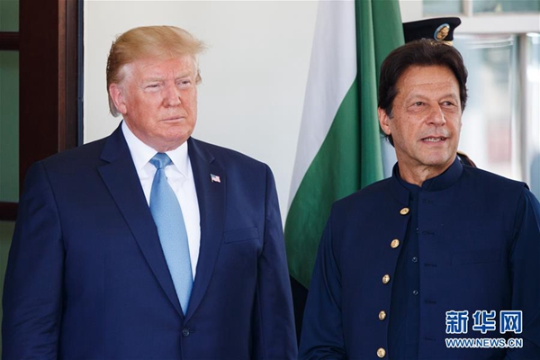 7月22日,在美國華盛頓白宮,美國總統特朗普(左)歡迎巴基斯坦總理伊姆蘭·汗。新華社發(沈霆 攝)