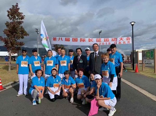 日本長井市市長內谷重治、副市長平進介、國際長征運動會創始人杜地以及部分運動員在比賽現場合影。(圖片由國際長征運動會委員會提供)