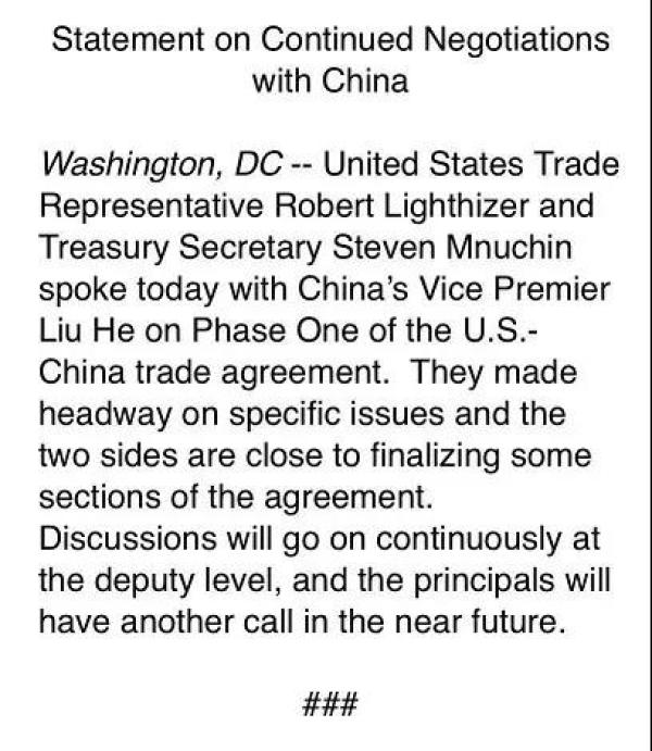 聲明中說,“他們在具體問題上取得了進展,雙方接近敲定協議的某些部分”,“雙方將繼續副部級層級的討論,高級別官員將在不久舉行再次通話。”