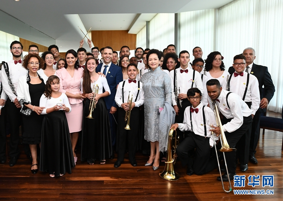 當地時間11月13日中午,應巴西總統夫人米歇爾邀請,國家主席習近平夫人彭麗媛出席金磚國家領導人配偶活動。這是彭麗媛同巴西青少年管樂團演員們親切交流。 新華社記者 謝環馳 攝