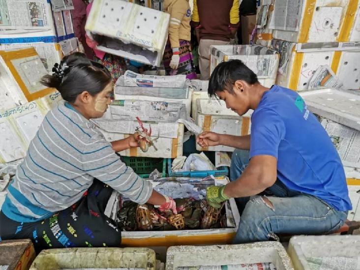 ▲1月3日,工作人員在云南省畹町水產(chǎn)品交易市場(chǎng)分揀來自緬甸的螃蟹。新華社記者姚兵攝