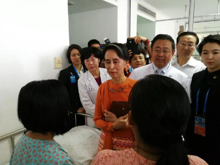▲2017年5月16日,緬甸國(guó)務(wù)資政昂山素季來到北京安貞醫(yī)院看望受救助在京做手術(shù)的緬甸先心病患兒。她在北京出席首屆“一帶一路”國(guó)際合作高峰論壇。新華社記者李雪笛攝