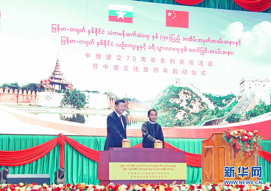 當地時間1月17日晚,國家主席習近平在內比都第二國際會議中心出席中緬建交70周年慶祝活動暨中緬文化旅游年啟動儀式。這是習近平和緬甸總統溫敏共同按下按鈕,正式啟動中緬文化旅游年。 新華社記者 黃敬文 攝
