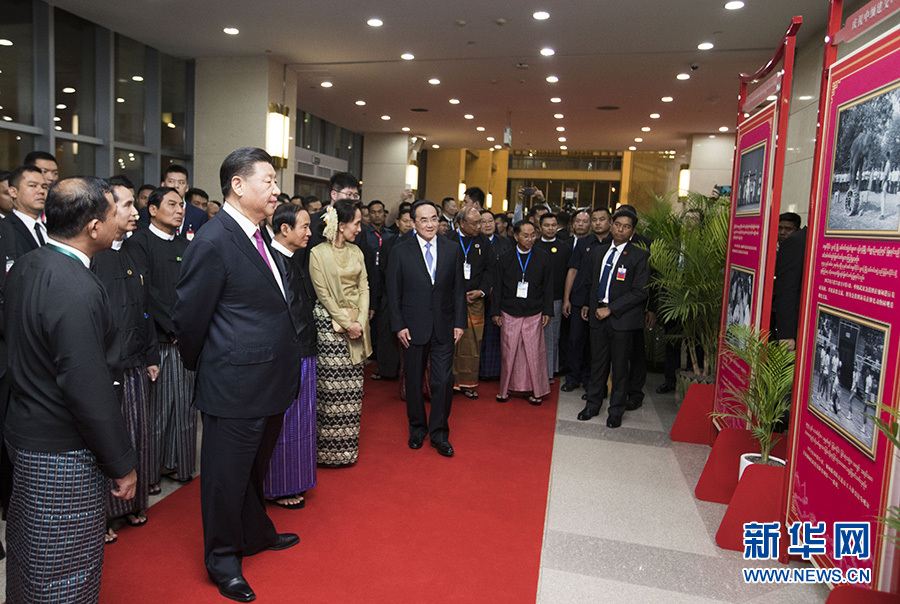 當地時間1月17日晚,國家主席習近平在內比都第二國際會議中心出席中緬建交70周年慶祝活動暨中緬文化旅游年啟動儀式。這是儀式開始前,習近平在緬方領導人陪同下,觀看慶祝中緬建交70周年圖片展。 新華社記者 黃敬文 攝