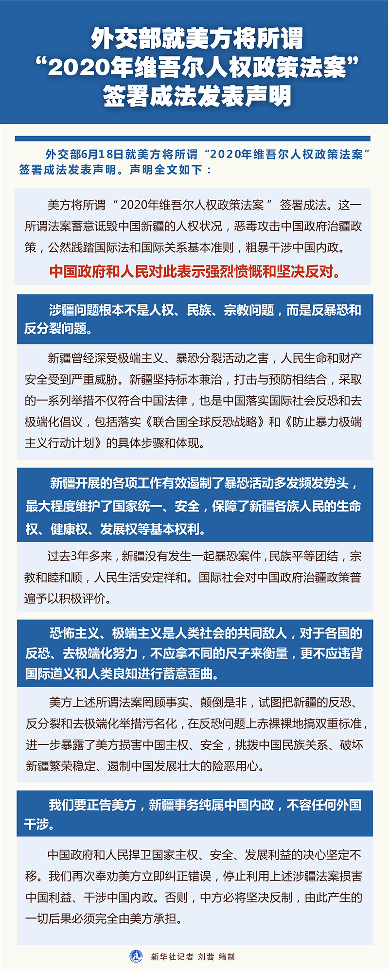 新華社北京6月18日電? 外交部18日就美方將所謂“2020年維吾爾人權政策法案”簽署成法發表聲明。聲明全文如下:
