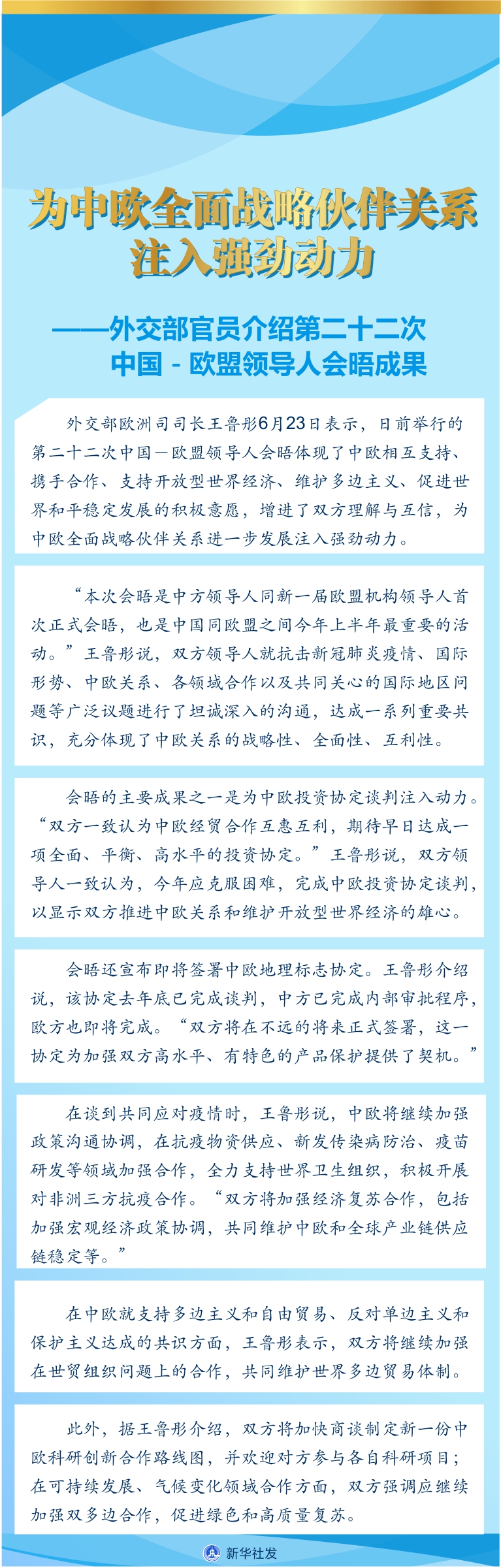 新華社北京6月23日電(記者王賓)外交部歐洲司司長王魯彤23日表示,日前舉行的第二十二次中國-歐盟領(lǐng)導人會晤體現(xiàn)了中歐相互支持、攜手合作、支持開放型世界經(jīng)濟、維護多邊主義、促進世界和平穩(wěn)定發(fā)展的積極意愿,增進了雙方理解與互信,為中歐全面戰(zhàn)略伙伴關(guān)系進一步發(fā)展注入強勁動力。