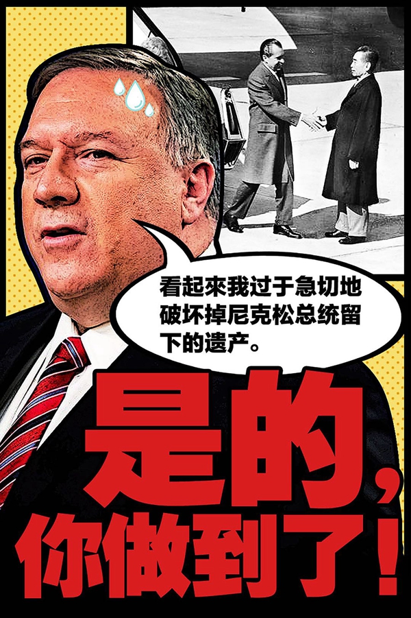 蓬佩奧選擇在“尼克松總統(tǒng)圖書館暨博物館”發(fā)表演說極具諷刺意味。中美近50年來的友好交往關系是兩國老一代領導人開創(chuàng)的,是對全世界的建設性貢獻。蓬佩奧作為中美關系的拆臺者,在此地演講不僅不配,而且是對尼克松總統(tǒng)的大不敬。