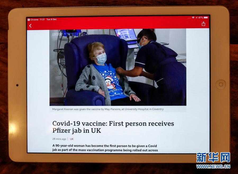 12月8日在英國倫敦拍攝的播放新聞的電腦屏幕顯示,醫護人員為90歲女子瑪格麗特·基南接種疫苗?,敻覃愄亍せ鲜窃搰孜唤臃N新冠疫苗的人。