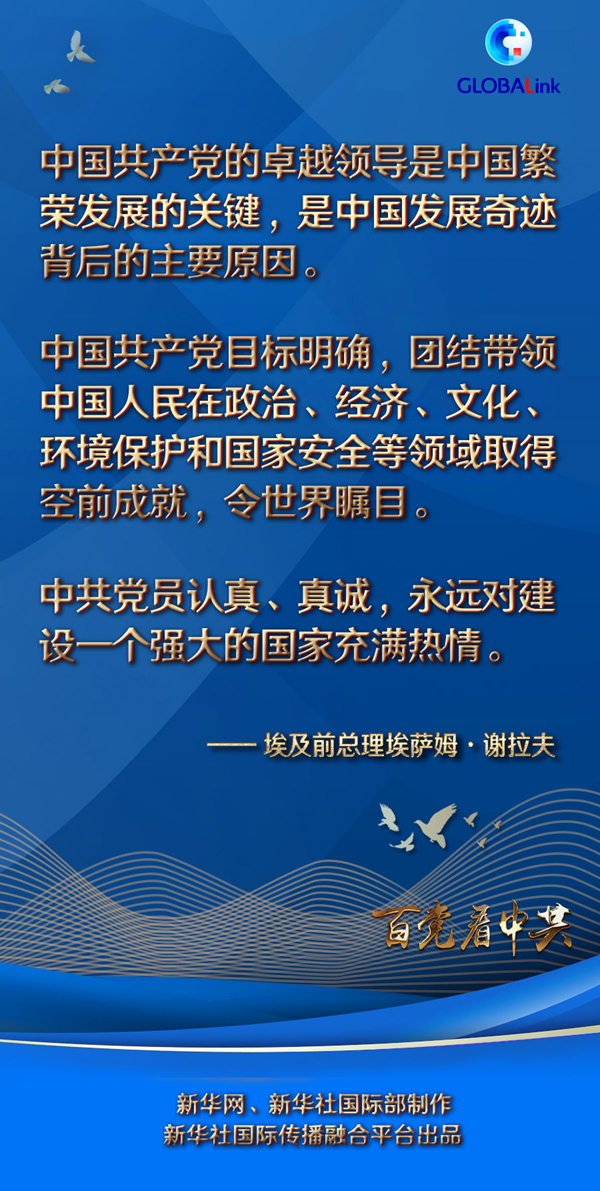新華社開羅7月2日電 埃及前總理埃薩姆·謝拉夫日前在開羅通過視頻方式接受新華社記者專訪時表示,中國共產黨的卓越領導是中國繁榮發展的關鍵,是“中國發展奇跡背后的主要原因”。